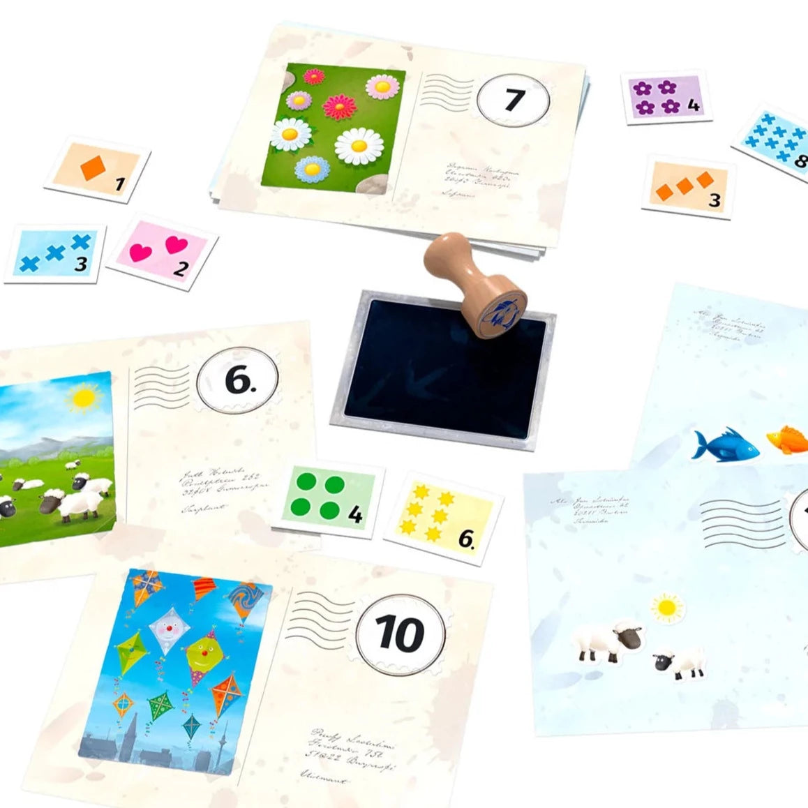 Il y a beaucoup d'effervescence à la Poste ! Pio du Pigeon Post a les ailes pleines ! Il y a tellement de courrier qui attend d’être envoyé, mais vous devez vous assurer d’utiliser les bons tampons, sinon cela pourrait être le chaos ! Les joueurs aident à calculer les frais de port exacts dont ils ont besoin pour envoyer leurs cartes postales. Il leur faudra un peu de chance et, surtout, de bonnes compétences en mathématiques pour accomplir leur travail. Le joueur qui peut calculer correctement les frais de port pour le plus grand nombre de courrier gagne. Deux niveaux de difficulté d'un jeu de mathématiques amusant pour les 5 ans et plus, avec des nombres de 1 à 20. Les tampons comprennent des formes pour les débutants et des numéros correspondants pour les mathématiciens plus expérimentés et les cartes postales sont recto-verso, également pour les différents degrés de difficulté.