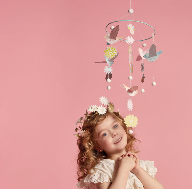 A stunning springtime-themed mobile. With its flowers and birds, this softly coloured mobile makes a beautiful decorative addition to a baby or child's room. The design features include;