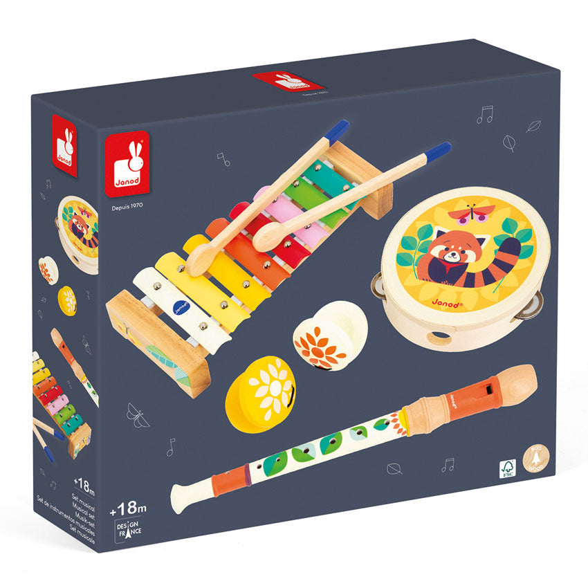 Let the music begin! Help your child discover a love of music with this colourful and cheerful musical set! This set includes a xylophone with 8 notes tambourine recorder and two castanets. Your child will have all the equipment they need to discover sounds and learn about the art of music - perfect for starting life as a performer and puting on their first show. This set of 4 pretend play musical instruments is ideal for developing a childs imagination and is part of the Janod Gioia Musical range. Made from FSC wood for children aged 18 months and over.