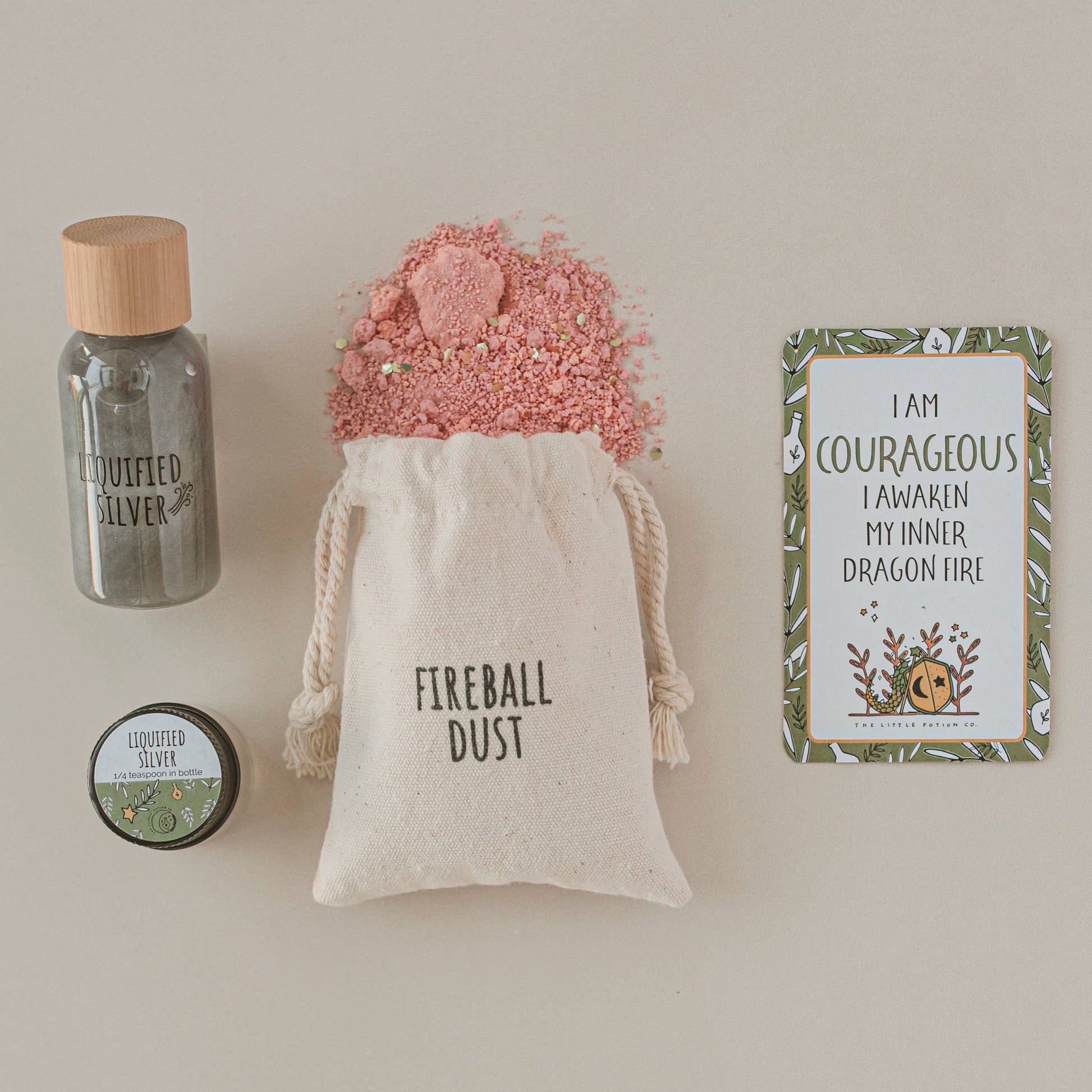 POTION KIT - comes with: • 1 x dry fizz ingredients in cotton pouches. • 1 x sparkly liquids in reusable PET plastic bottles with bamboo screw cap. • 1 x 10ml Glass jar of refill liquid powder to fill up your bottle for extended play • 1 x mini affirmation and spell card