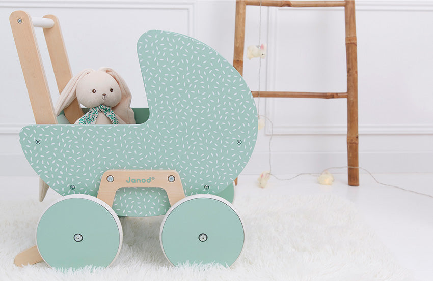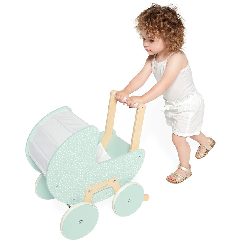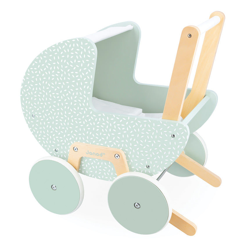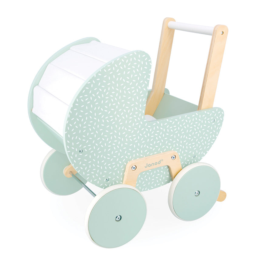 This beautiful wooden Zen Dolls Pram is a must-have accessory for taking care of special teddies or dolls and is perfect for children aged 18 months and up. A soft blanket and pillow are included and with its fabric canopy and fresh colour-way this authentic looking replica is ideal for accompanying your child as they explore the world. This dolls pram also makes a beautiful walking aid for little ones: it is equipped with an anti-tilt system that can be removed when the child is comfortable enough, and its silent rubber trim wheels help to achieve a smooth and quiet ride.