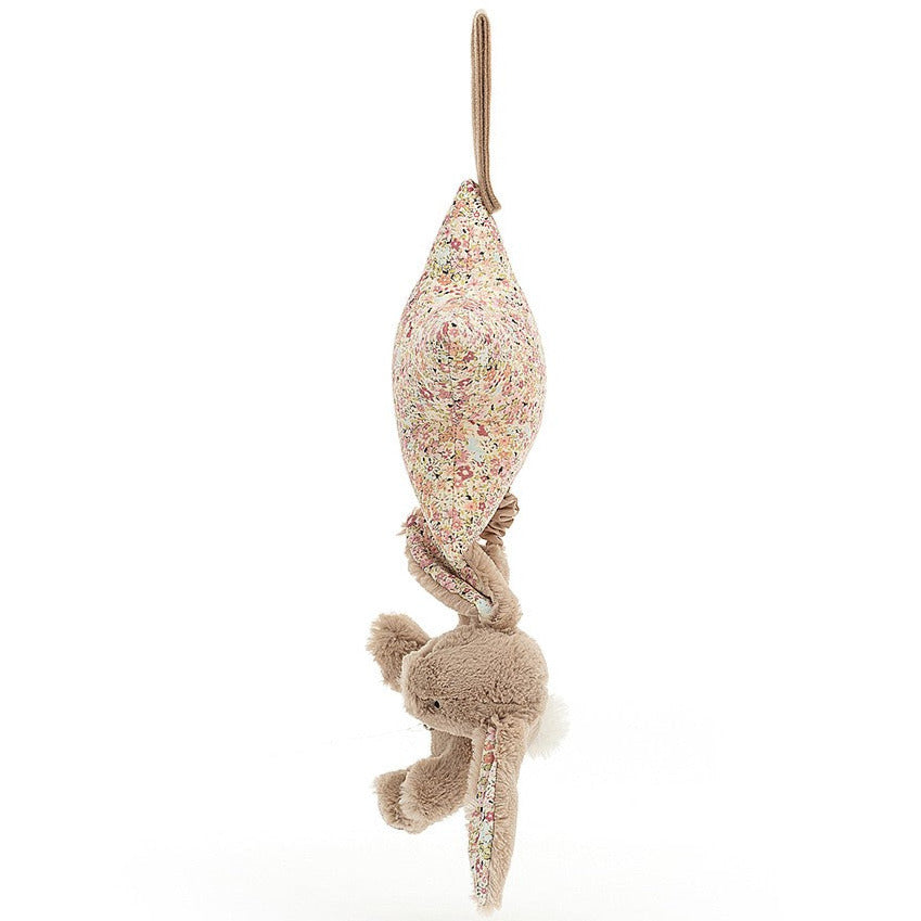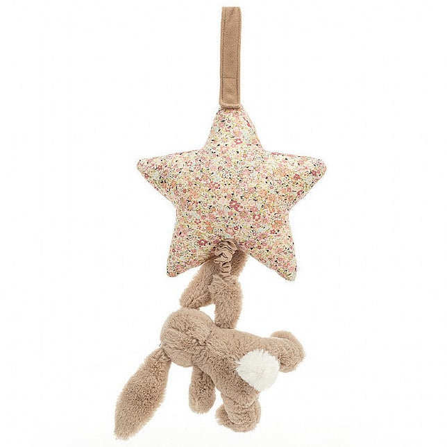 Blossom Bea 米色兔子音乐拉杆将音乐梦带到月光下。我们的小兔子正紧紧抓住一颗可爱的花星。把这个朋友固定在婴儿床或婴儿车上,拉动它,就能听到勃拉姆斯的《摇篮曲》。它是让您安然入睡的镇静伴侣。