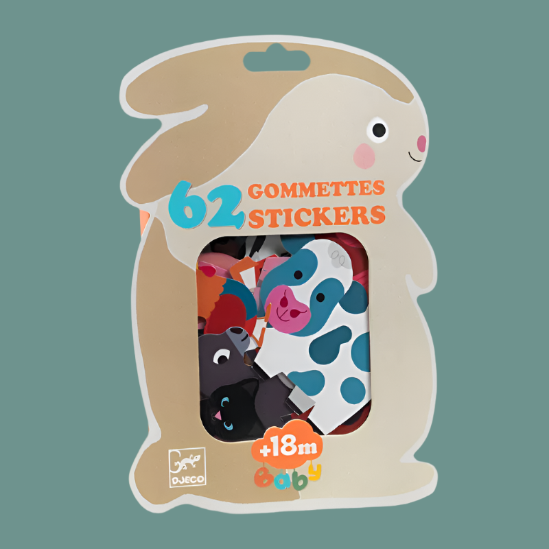 My first stickers! Open this lovely transparent rabbit shaped box to discover 62 farm-animal themed stickers. Suitable from just 18 months of age, Baby’s first stickers are made of thick, perforated paper so they can learn to peel them off without help.