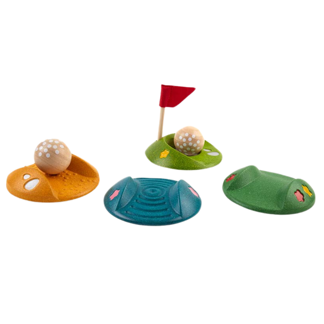PlanToys 迷你高尔夫套装包括 2 个儿童木制高尔夫球杆、2 个木球、3 种不同类型的具有挑战性的赛道和 1 个洞。