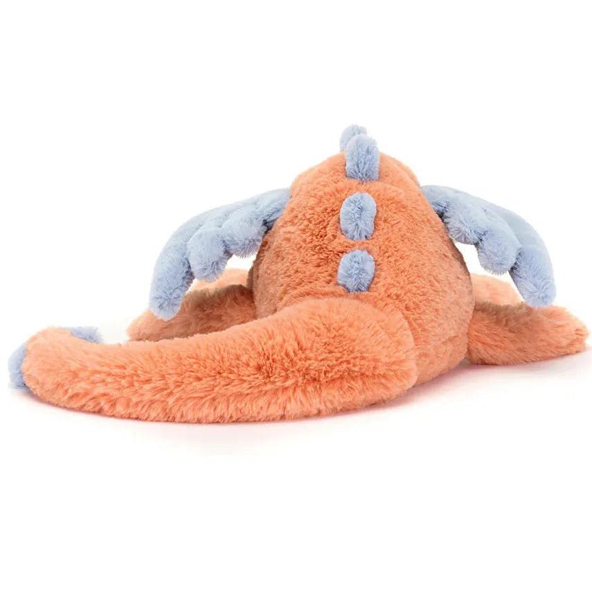 Persimmon Dragon is stretching out so we can admire that vibrant fur! This warm coral dragon is carefully detailed with delicate stitching all over. With indigo wings, ears, spines and tail dart, flopsy paws and a long, weighted tail, Persimmon brightens up any nursery. Suitable for all ages.